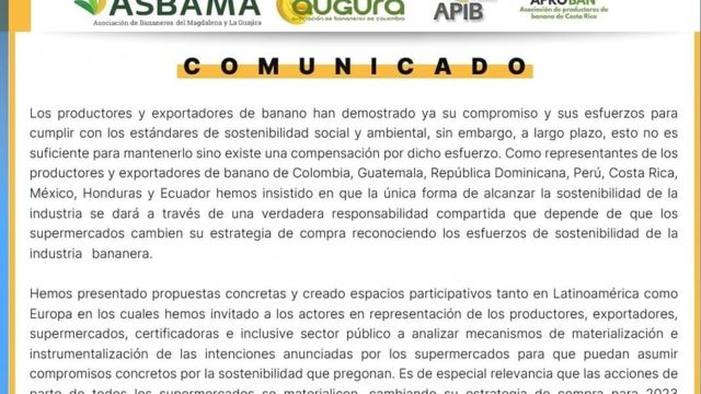 Los productores y exportadores de banano de Colombia, Guatemala, República Dominicana, Perú, Costa Rica, México, Honduras y Ecuador damos a conocer nuestra posición ante los requerimientos para cumplir con los estándares de sostenibilidad.